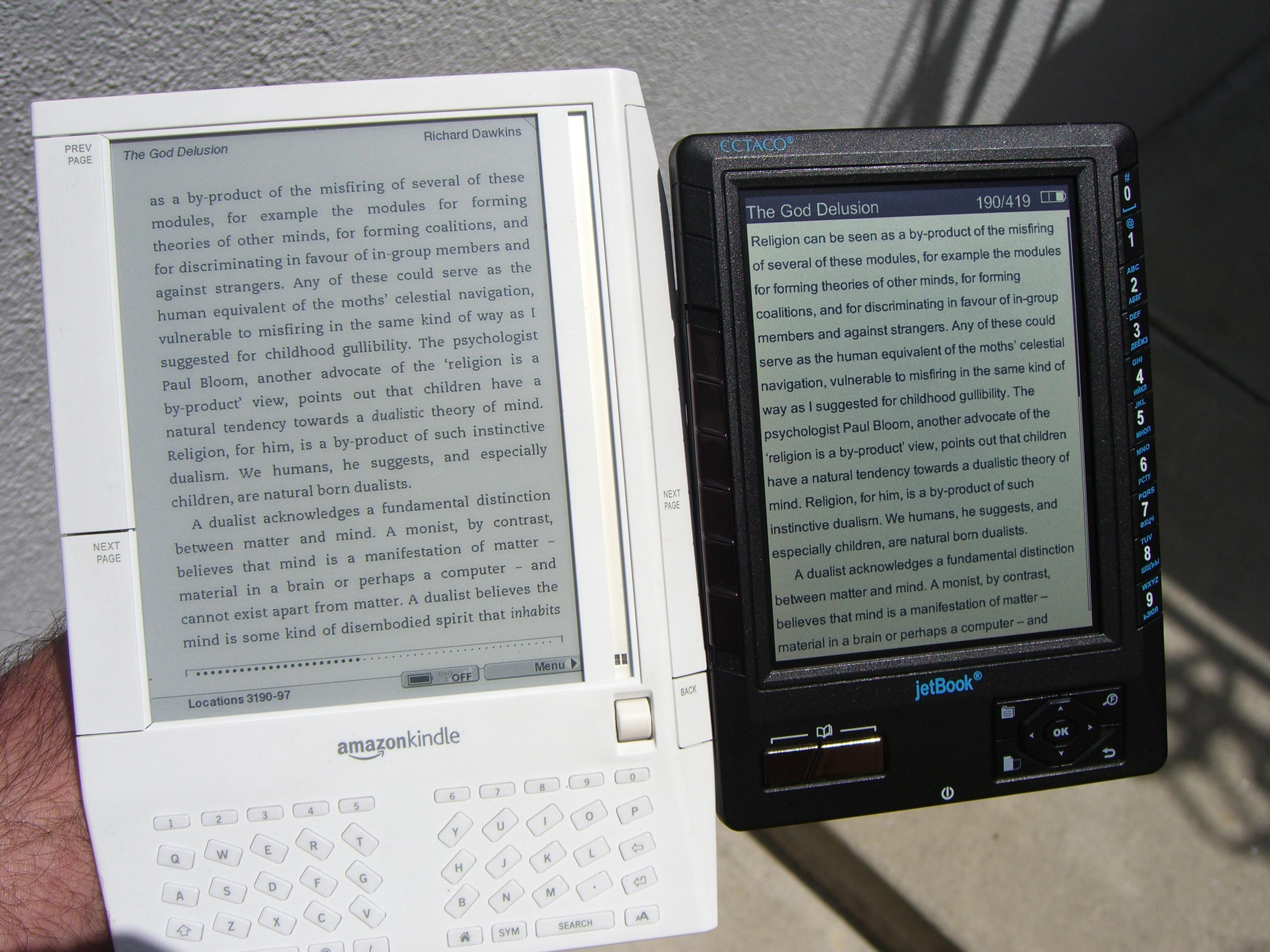 It's the one for me. Paperback cool, instantaneous no flash-refresh page turns, at least equal (better to my eyes) readability to E-ink, and most definitely easier for me to read in lower light levels. Today, thanks to this forum, I learned how to move Kindle books bought with my iPod Touch to the jetBook. The Kindle will be sold shortly. The first shot is THE Sun on the Kindle, the second on the jetBook, and the third after I angled them both slightly, the sun just off their screens. Last edited by galavanter; 04-29-2009 at 06:37 PM. |