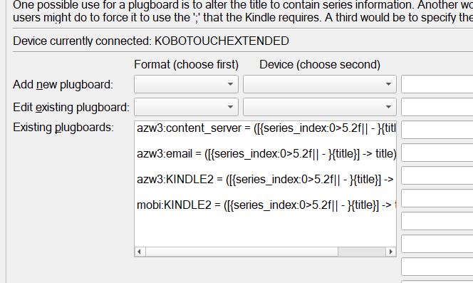 As you can see, there is no Kobo entry in my plugboard. That is because the driver handles that natively . But something to remember. Series (and some other metadata) is transferred on the SECOND connection. That is because the first disconnect is when the Kobo creates the Database entry it uses. The Second connect now has a place for the metadata to be stored. |