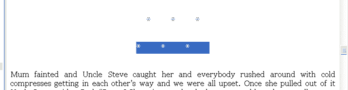 At first, just .stars {text-align:center;margin:1em 0;} <div class="stars">***</div> Then spaced then out with nbsps. Then I thought to use letter-spacing: .break0 {text-align:center; margin:1.5em 0;font-size:1.25em;letter-spacing:2em;} <div class="break0">***</div> But I noticed that it wasn't centred, either in Sigil preview or on Kindle after conversion. The highlighted line in the screencap is noticeably left of page centre. (Text and page have zero margins.) Selecting it includes a space on the right, which is not a separate character in the code. Normally, spaces at the end of a line are ignored for centring anyway. So it seems that letter-spacing in CSS isn't really "space between letters", it's "space after letters". Or maybe they deem the EOL a letter. I'm sure this is all perfectly correct behaviour, but it isn't what I wanted, so to nudge it back to the centre, I added padding: .break {text-align:center; margin:1.5em 0;font-size:1.25em;letter-spacing:2em;padding-left:2em;} That's the top line in the screencap. Offering this work-around in case anyone else is caught out. Last edited by AlanHK; 08-07-2024 at 03:06 AM. |
