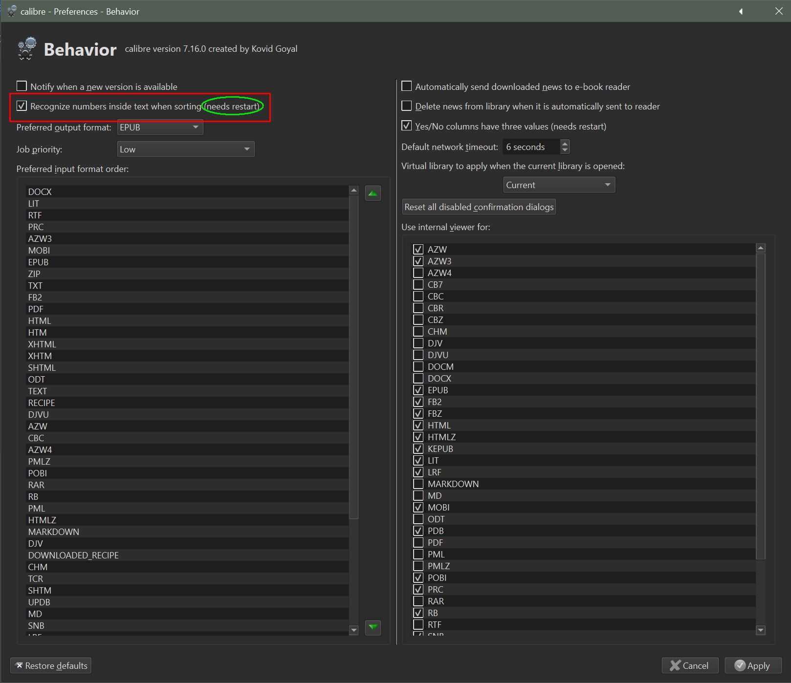 I was hoping there was a way to tweak or maybe a new feature to add where the titles could be sorted via alphanumeric order. [1, 2, 3, 10, 11, 20] Is just that I like sorting my books by title, and the current sorting method makes it awkward to browse when there are more than 9 instances in a series. Yes, I know I could sort it by series, and I have that column ready, the problem is that some books have no series, and that causes the entire library to place those in a different group from those with series. Another method would be, if possible, to when click on the title header, would automatically set the rolls following the series header. |