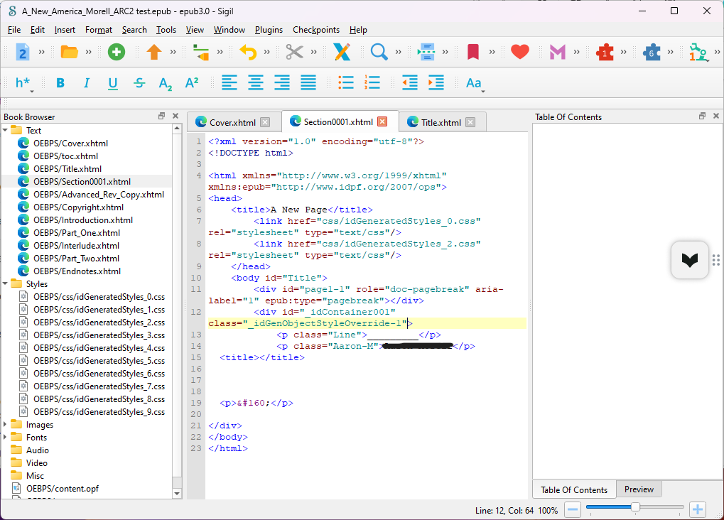 So I am not sure what you mean by "it caused a the table of contents to appear on ebook pages". All I see is a Table ofContents Window in the right hand side Dock position. If you click on the tab that says "Preview" in the lower right side of the screen, you can make the Preview Window appear, and hide the Table Of Contents. Last edited by KevinH; 08-24-2024 at 11:49 PM. |