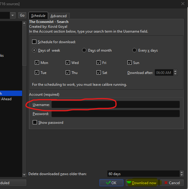 after loading the recipe to custom sources, go to fetch news, select the recipe. You'll see Account (required) on the right side, type your search in the Username field there and download. |