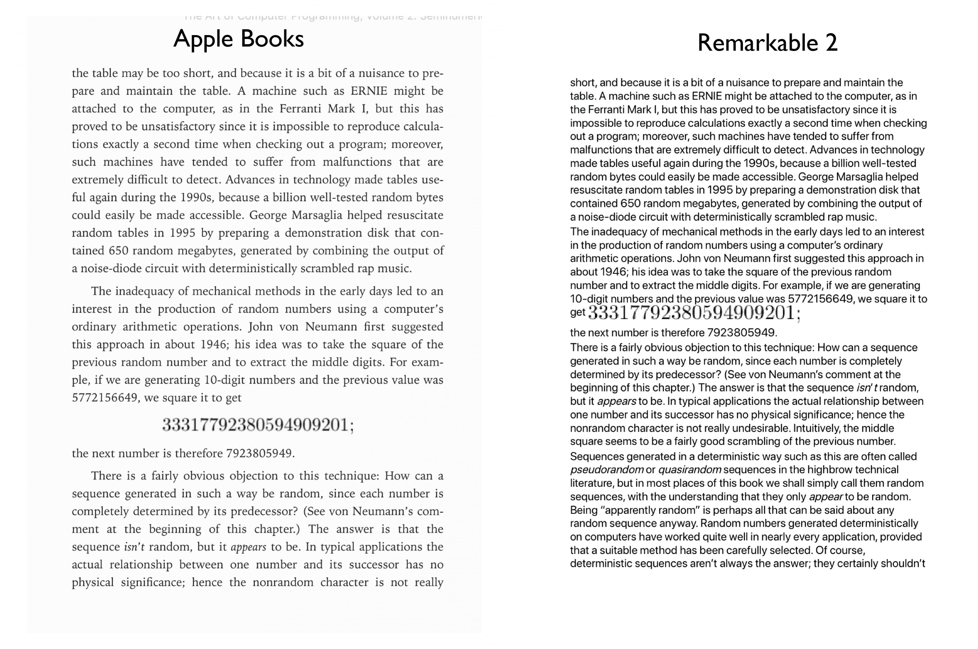 Remarkable will also read ePub format ebooks but the one time I played with the Remarkable 2 and ePub, it's CSS handling had very iffy. The owner was not certain if it was actually rendering the ePub or if it was converted to PDF at some point. I'm attaching two images from a Reddit post showing Books vs. Remarkable for ePub renderering. And yes, Remarkable seems to prefer left justified even when the CSS specifies text-align: justify.