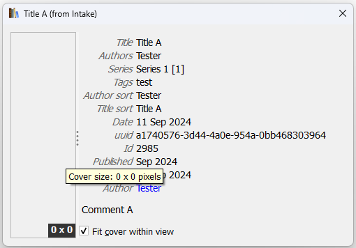 No, there is really no automagically generated cover picture as the "open book folder" showed. But yes, because both the "Edit metadata" and "Book Details" pop-ups suggest there is one (even 1200x1600). A case of dummy image insert, which certainly mislead me. A suggestion would be to make the behavior similar: When there is no cover, do not show anything (my preference), or let all pop-ups show a dummy image for a consistent behavior. |