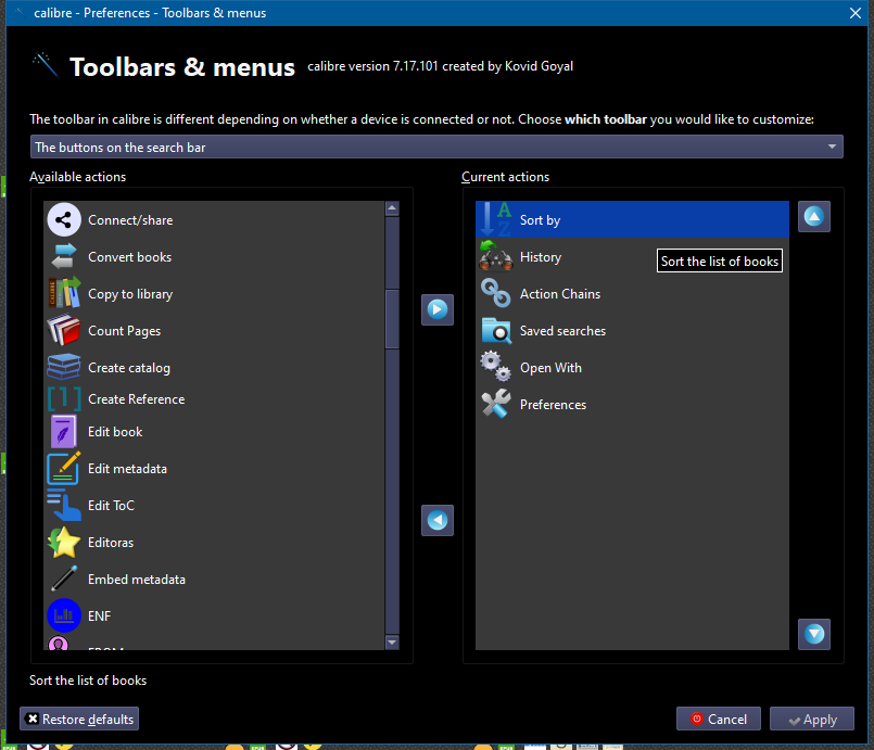 (sorry, some things have been set (and forgotten) up years ago Preferences Toolbars: Context Menu: (for books in...):Sort by It is a A above Z with a down arrow, Icon |