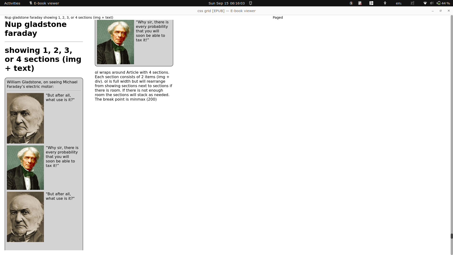 Tech rant: I want to be able to use container queries in epub. Can't even use grid yet; only flex is loosely supported. So many advantages for container queries! None of the dedicated commercial readers are capable, though. Only computer-based epub software (and only some) would be able to use cqw , cqh , cqi , cqb , cqmin , and cqmax. The ability to effectively read the same epub on tiny phones, mid size, or giant size screens while keeping captions and images and text sizes in good-looking layout is difficult without this new tech.