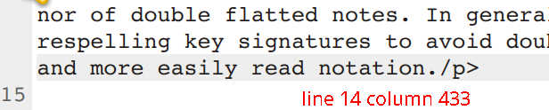 3. If the closing > is the one missing at the end of the same paragraph, (on line 14, column 436), the error message returns error at line 16, column 3.