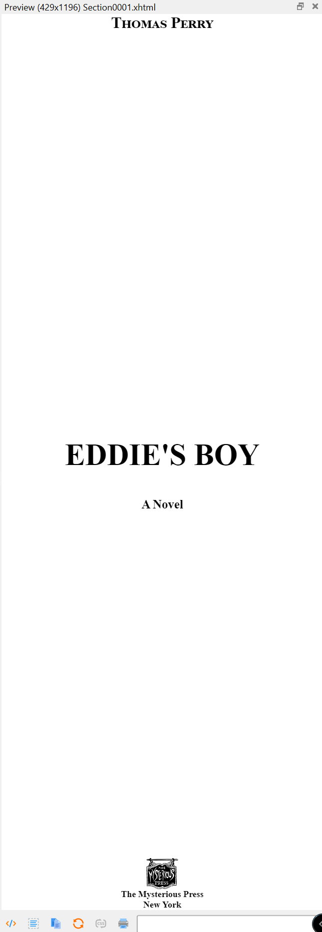 CSS: body, p {text-align:center; font-family:serif; font-weight:bold; text-indent:0; padding:0; margin:0} h2.title {font-size:2.7em; text-transform:uppercase} .auth {font-size:1.4em; font-variant:small-caps} .sub {font-size:1.1em} .pub {font-size:.8em} .pub img {display:block; width:10%; margin:0 auto} div[class^="v-"] {height:100vh; width:100vw; display:table; position:fixed} div.v-top div {display:table-cell; vertical-align:top} div.v-mid div {display:table-cell; vertical-align:middle} div.v-btm div {display:table-cell; vertical-align:bottom} Code: