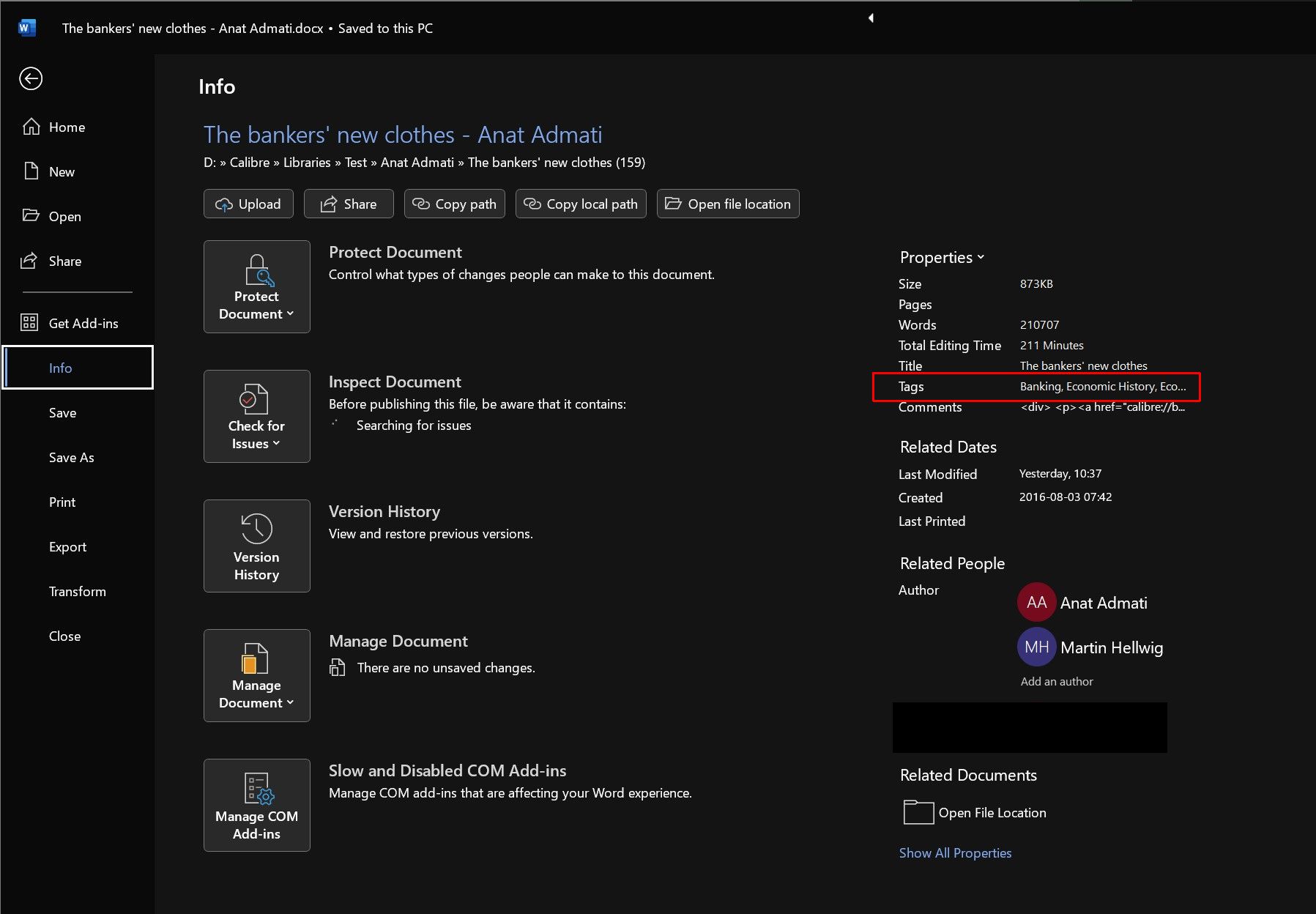 However, a bit sadly, Calibre on the Mac doesn't seem to be able to write to a file's Mac-native tags. Five minutes ago, I imported a newly created Microsoft Word file into Calibre 7.19 and applied two tags to it within Calibre, and ran Calibre's "embed metadata" successfully. After that, I was not able to see any tags in the Word app (File > Properties > Summary > "Keywords" field), nor with the Finder app (Finder is the Mac equivalent of Window's File Explorer). Out of curiosity, I added a tag "test-tag" to this Keyword field in Microsoft Word to see if it would show up as a Mac-native tag – it did not, but it did show up as a keyword in the Finder app. The screenshot below shows this outcome: I took a few steps back to see if Calibre's tags might also be embedded in this manner am happy to see that it does: At this stage, I'm looking for some automated way of getting these keywords to be reflected as Mac-native tags. Last edited by pdurrant; 09-30-2024 at 04:42 AM. Reason: attached images in the post. |