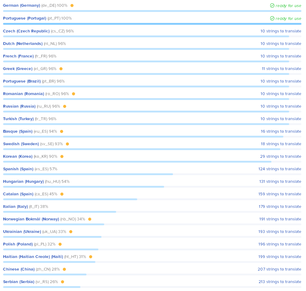 2024 Update: New translation platform using Gitlocalize: https://gitlocalize.com/repo/9640 No software to install! Please join in and help translate. I'll keep the master languages updated from GitHub. Related - Transifex has also been used to translate: