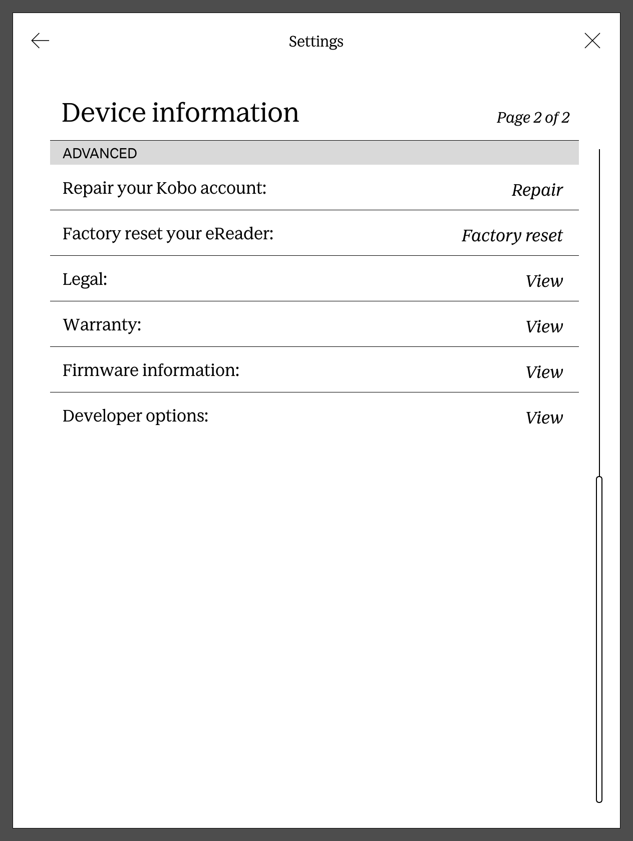 I also have landscape mode. I think it was added at some point through a firmware update. Does anyone know anything about the Clara BW? So developer options also work, as described. Unfortunately landscape mode doesn't work. Do I have to wait for a firmware update until landscape (for kepub, epub) works? The method using the configurations file doesn't work properly, ie landscape works with it, but the condition doesn't. Everything seems to be turned upside down (the functions). Does anyone have a tip on what I can do? I urgently need landscape on my Kobo Clara BW. Why did they forget it? I know not everyone needs it. But I've gotten so used to it on the Clara HD that I'd rather not do without it on the Clara BW. I hope for a quick solution. famfam |
