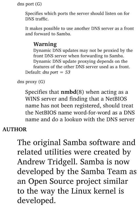 cp /usr/share/man/man5/smb.conf.5.gz . gunzip smb.conf.5.gz pandoc -f man -t epub -o smb.conf.epub smb.conf.5 Last edited by Shohreh; 10-29-2024 at 06:13 PM. |