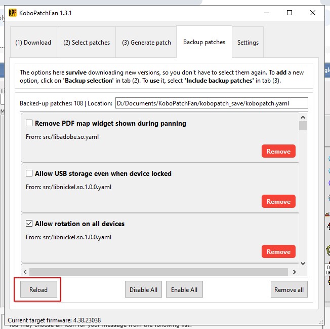 Code: version: 4.38.23038 in: src/kobo-update-4.38.23038.zip out: out/KoboRoot.tgz log: out/log.txt 3. Put kobo-update-4.38.23038.zip to the src folder. (image 4) 4. Open KoboPatchFan, go to the Download section and select the firmware (image 5) 5. Go to the Backup patches section, and click Reload (image 6). 6. Go to the Generate patch, click Include backup patches, and click Run (image 7) Hope it works Last edited by hatuluang; 10-22-2024 at 07:34 AM. | |