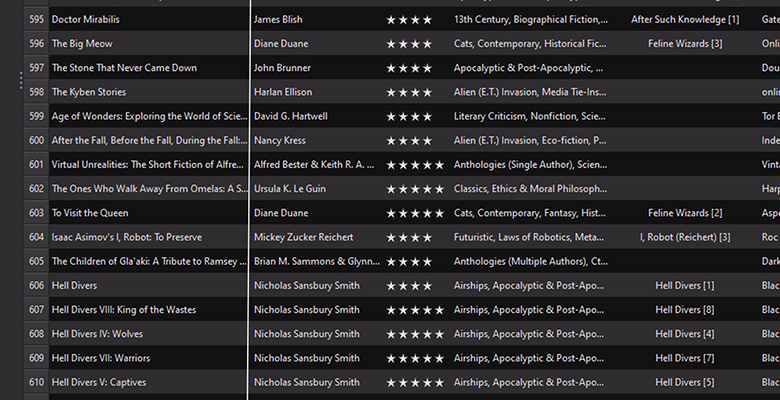 I would like to add Grid Lines / Column Lines between my various columns in my Calibre program. ![]() I've attached an image when I photoshopped in a line between Titles and Authors to show what I would like to do. Can one do this? If so, how does one do this? ![]() P.S. After I posted, I did finally find another post where it says this can be done in Preferences/Look & Feel -- BUT I cannot find in L&F where to do this! THANKS. ** Last edited by bostonpolar; 10-22-2024 at 12:24 PM. Reason: additional information |