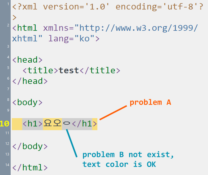 A. When highlight matching tags the highlight of the ending tag is "off" because of the "composing string" glyph. and B. The "composing string" glyph is somehow rendered in a colour that does not show up against the black background, white background, or line highlight color. Problem A can be made to go away by disabling the highlight matching tag pair. Right? Why can't problem B be made to go away by just changing the line highlight colour? I keep looking at the OP's video but he/she types so fast I can not see the Problem B happening at all just Problem A. What am I missing? |