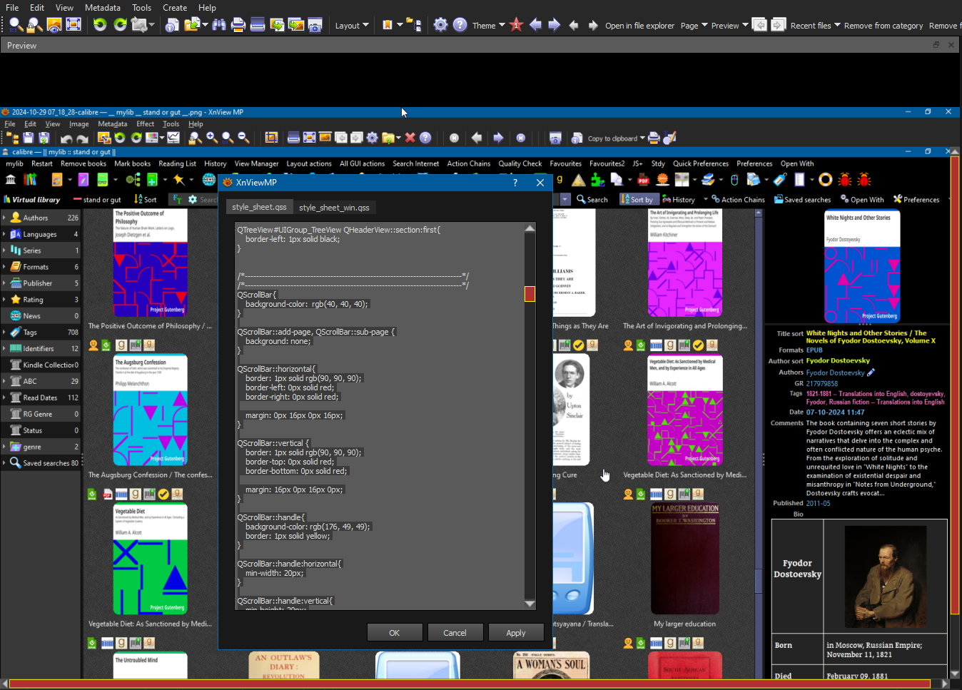 I remember you're not much a fan of adding CSS/QSS in the code, because it tends to break things. Today I went to update Xnview, which is also a Qt-based program, then I found it has an option to skin the scrollbar handle, as shown in the screenshot for a test I did: So I wonder: since Qt has been updated in recent Calibre versions, would it be possible now to change the scrollbar handle color? This is the relevant code in that screencap: PHP Code: