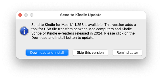 Version 1.1.1.258 now includes a tool to allow USB transfers from Mac to Kindle readers released in 2024. I wonder if this will mean that Amazon re-enable Download and Transfer? |