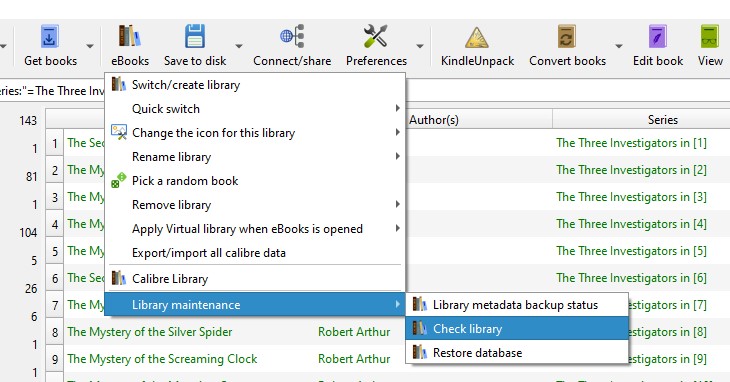 I tried that - although for me it was in the "Calibre Library" icon. It said "Found no errors in your calibre library database"