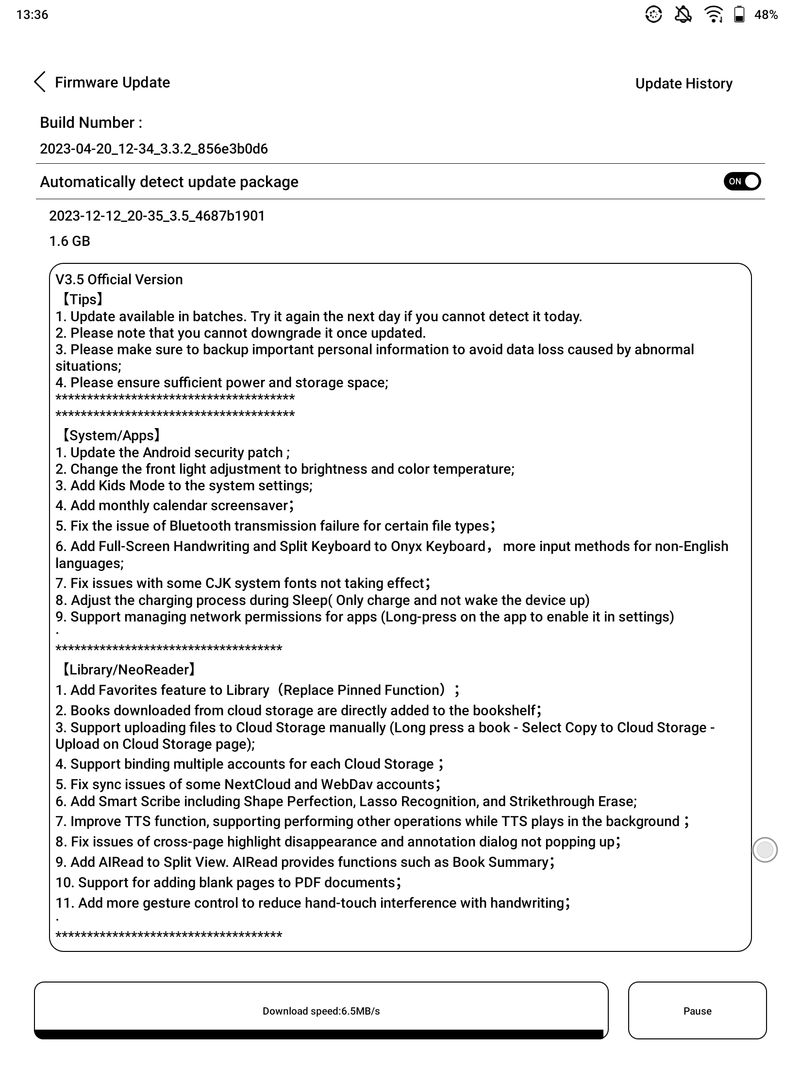 V3.5 Official Version Tips 1. Update available in batches. Try it again the next day if you cannot detect it today. 2. Please note that you cannot downgrade it once updated. 3. Please make sure to backup important personal information to avoid data loss caused by abnormal situations; 4. Please ensure sufficient power and storage space; ************************************** ************************************** System/Apps 1. Update the Android security patch ; 2. Change the front light adjustment to brightness and color temperature; 3. Add Kids Mode to the system settings; 4. Add monthly calendar screensaver 5. Fix the issue of Bluetooth transmission failure for certain file types 6. Add Full-Screen Handwriting and Split Keyboard to Onyx Keyboard more input methods for non-English languages; 7. Fix issues with some CJK system fonts not taking effect 8. Adjust the charging process during Sleep (Only charge and not wake the device up) 9. Support managing network permissions for apps (Long-press on the app to enable it in settings) · ************************************ Library/NeoReader 1. Add Favorites feature to Library Replace Pinned Function 2. Books downloaded from cloud storage are directly added to the bookshelf 3. Support uploading files to Cloud Storage manually (Long press a book - Select Copy to Cloud Storage - Upload on Cloud Storage page); 4. Support binding multiple accounts for each Cloud Storage 5. Fix sync issues of some NextCloud and WebDav accounts 6. Add Smart Scribe including Shape Perfection, Lasso Recognition, and Strikethrough Erase; 7. Improve TTS function, supporting performing other operations while TTS plays in the background 8. Fix issues of cross-page highlight disappearance and annotation dialog not popping up 9. Add AIRead to Split View. AIRead provides functions such as Book Summary 10. Support for adding blank pages to PDF documents 11. Add more gesture control to reduce hand-touch interference with handwriting · ************************************ Notes 1. Add Favorites feature to Notes Replace Pinned Function ; 2. Add Smart Scribe including Shape Perfection, Lasso Recognition, and Strikethrough Erase; 3. Long-press on Canvas to insert a Text box 4. Add filling-in colors to an enclosed area 5. Add 2 textures to the pencil brush 6. Add Free Lasso tool 7. Add Smart Scribe including Shape Perfection, Lasso Recognition, and Strikethrough Erase; 8. Add text direction recovering older versions to Text Notes 9. Fix the issue of missing content when exporting notes; 10. Optimize handwriting recognition accuracy and speed 11. Optimize the notes sync process. |