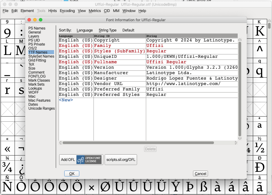 And here is the info for the Uffizi font. I think the issues are similar to the first font I posted, but I can't figure out if there is a specific name field/value that I need to change in FontForge to make it work properly.