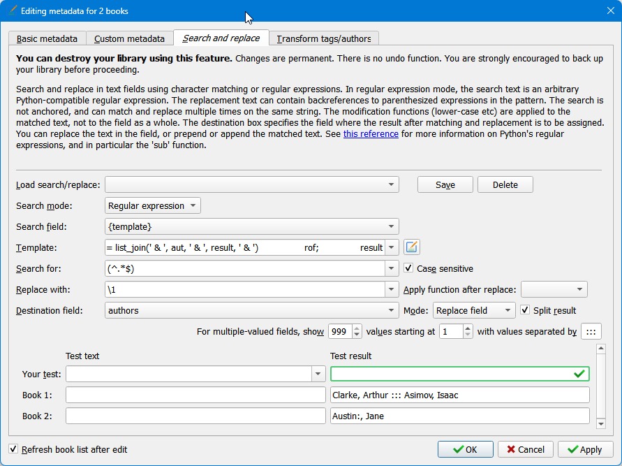 The image on my original post also shows the correct result. When using template search & replace the test result show the "after" in both the "Test text" and the "Test result" because the template output is the source. |