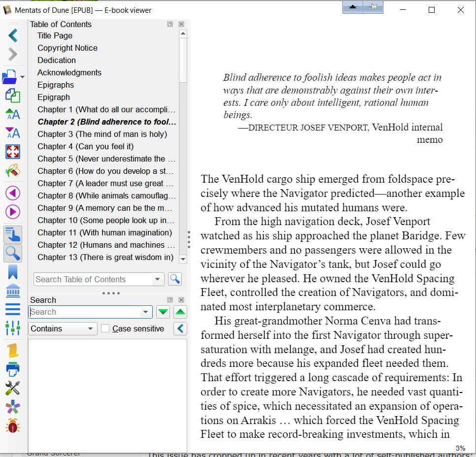 In this case each new chapter started wiit a small epigraph in a lesser font. So I would have to browse through the whole book to find the next chapter and then add it in the TOC editor. Simply too much trouble. The more expensive edition with the TOC has 82 chapters with a number and a few more without a number. |