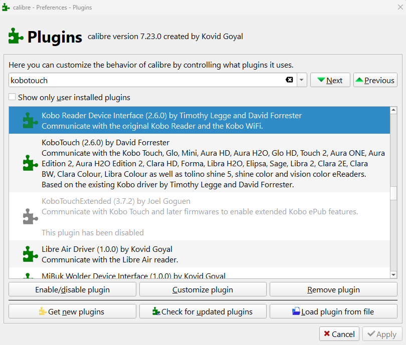 The ebooks are sent to the root of the e-reader, in directories bearing the names of the authors. I have never touched this setting. I just tested, but the result is the same. The ebook is no longer at the root of the e-reader but in an Ebooks directory, but it is still not visible on the e-reader (although I can see it clearly in Windows Explorer...) Really the problem seems to be updating the metadata on the eReader. I no longer see the little progress bar indicating its update on the Libra 2... Can you tell me how to disable the Kobo driver and leave only the KoboTouch / KoboTouchExtended drivers please? I take note of your remark about storing the library on the NAS, I will move it right away. Oh yes, and I already checked the database via KoboUtilities, and it tells me that the database is clean. I have already reset the e-reader 3 times, I don't think the problem is with the database. Or Caliber corrupts it immediately... |