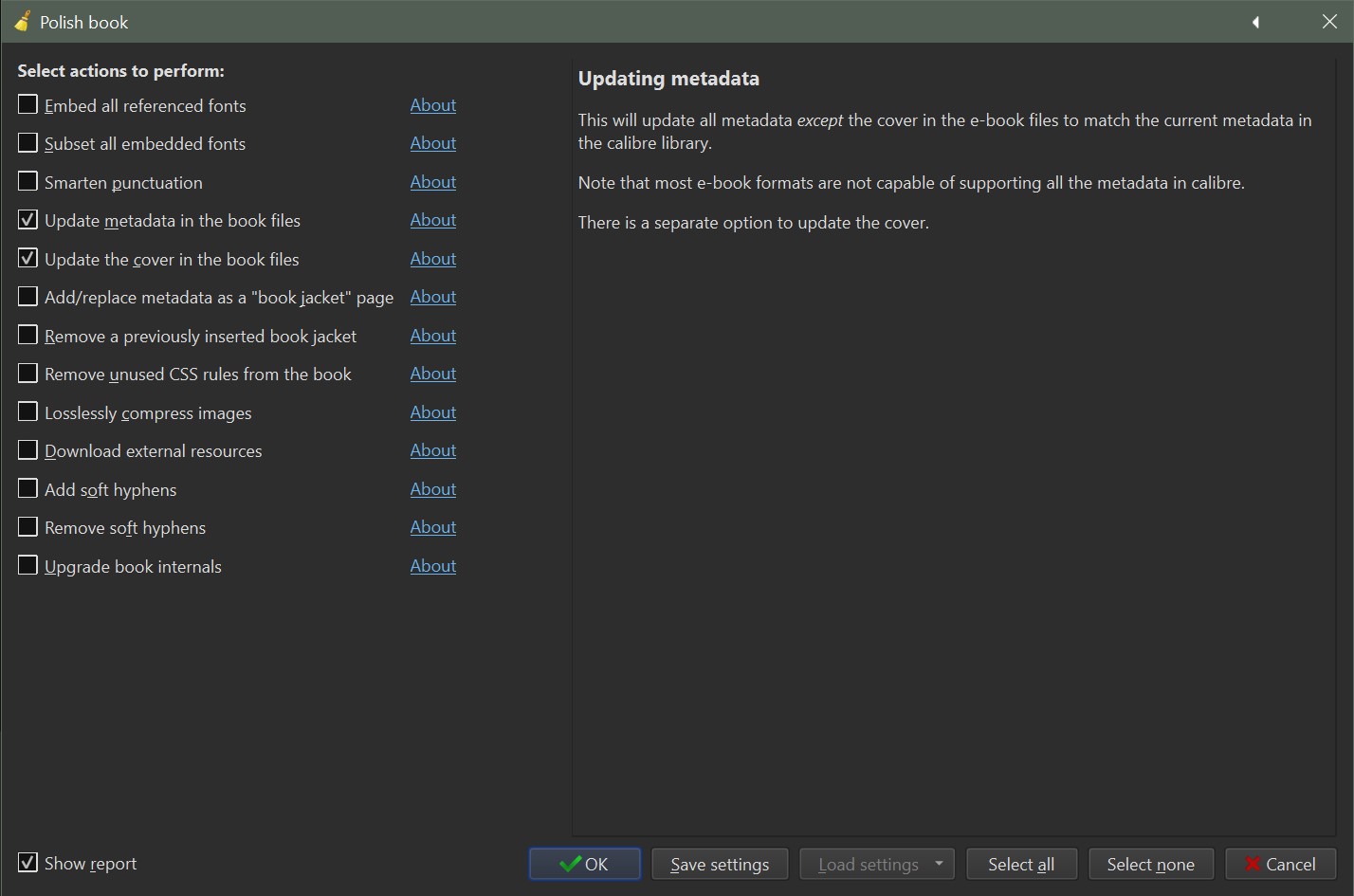 You can save the entire library, but you don't need to do that; Polish Books or Modify Epub will embed the metadata as well.