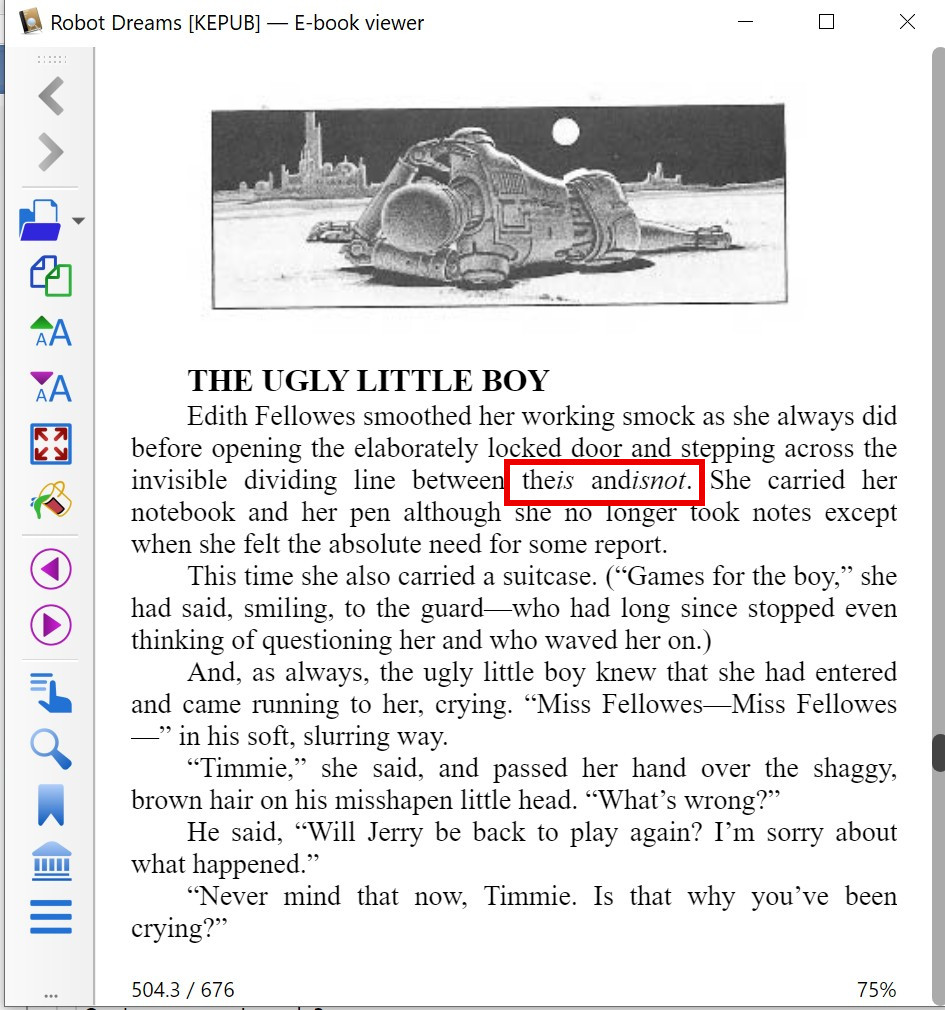 The issue may exist with other ebooks as well, but this is the one I noticed the problem. I have a mobi version of the ebook "Robot Dreams" by Asimov. I am using Calibre to convert it to epub and then sync it to my Kobo Libra Color which, because of the plugin, is converted automatically to kepub. Here is the problem: if I have word in regular text followed by a word in italics, the two words appear as one concatenated word with no space separating them. If I try to highlight, both words are highlighted as one. I also tried to convert the ebook directly to kepub in Calibre and when opened with the Calibre e-book viewer, I see the same problem. However, if I take the epub file (not the kepub) and upload it via Google Drive to the kobo so it isn't converted by the plugin to kepub, or if I open the epub file with the Calibre e-book viewer, all is OK. I attached two screenshots show how the KEPUB and the EPUB files are displayed in the Calibre e-book viewer. |