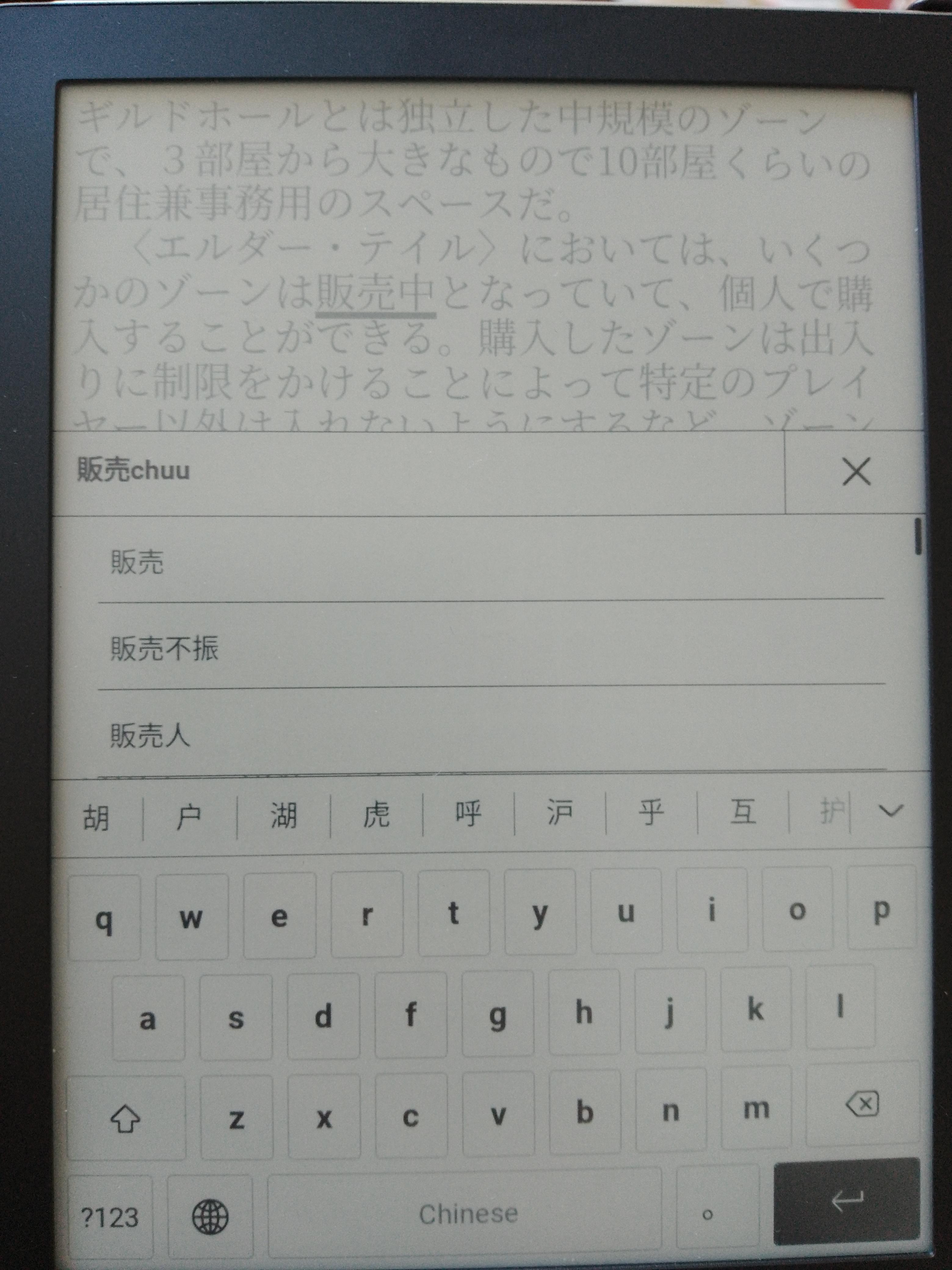 But, since a native-character keyboard would definitely help the dictionary, I'm continuing the discussion here, though the keyboard part may be slightly off-topic. I wonder (total ignorant here, so it may be a silly idea) if the keyboard doesn't work because the number of Japanese characters is higher than the number of keys on the standard QWERTY keyboard? Or (and i think this more likely) it's not be supposed to work that way, by simply mapping a character to a key. This is what other virtual Japanese keyboards do: The characters you see in keyboard.txt are syllables - well, not quite, but it's the closest thing. か is ka, ね is ne and so on. To write か, you don't press a specific key; first you type a "k" and the keyboard writes in a k provisionally (or just waits). Then, if you type an "a", it writes a か (and suggests other characters that have the "ka" reading, like 家, 火, 歌...), or a く and the alternatives if you write a "u" after it, etc. etc. I've tried the Chinese keyboard that comes pre-installed, and it works the same way Japanese ones do (I don't know Chinese, but the workings should be very similar). I've attached a picture, so you can see it takes input from the regular QWERTY: I've written "chuu", which has temporarily been input into the search box, and on top of the keys I'm given a selection of characters which have the "chuu" reading and which I can tap to input and search them. Just how it does that, though, is a mystery to me. Prompted by another thread here (thank you, @EastEriq!), I've looked into system/language/keyboard and system/config/global.cfg. The first only contains files for EN, IT, RU and UA (so not even for all the languages that come with the device). The second does include a line that reads language=ZH (which I'm taking to be Chinese), but the following lines are nothing I can make sense of. (I can copy-paste the content of global.cfg if anyone is interested.) The device doesn't even have a Chinese dictionary, but it must keep all those characters somewhere. Also, I remember someone saying on some forum that they only got their Japanese keyboard to work after switching to the pre-intalled Chinese keyboard, then switching back to the English one. Odd. I've attached a .zip with 1) the accessory files (with the extended, "better" collates.txt, but the other two are directly from your JaK folder, Markismus), 2) the .xdxf JA-EN dictionary, which, iirc, I converted from the awesome JMdict, and 3) the resulting .dic dictionary for Pocketbook. |