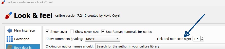 ![]() We've changed book details to scale the size of the icon according to the font size. In addition we've added an option to Prefs / L&F / Book details to additionally scale the icon size up or down. The above image shows using a scale factor of 4.0. This one is 1.4, which I like. Changes are in current source. |