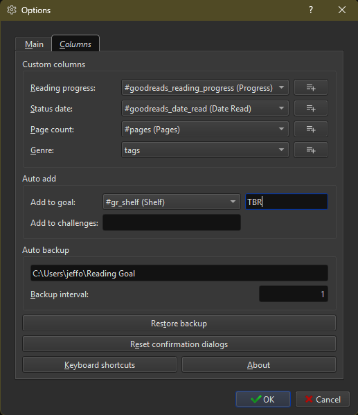 I'm trying to use this plugin for the first time. I was able to get the plugin configured, but then after refreshing my data in the goodreads plugin (fixed some dates and refreshed my shelves), then updating the progress on a book I started I can't run the Reading Goal.