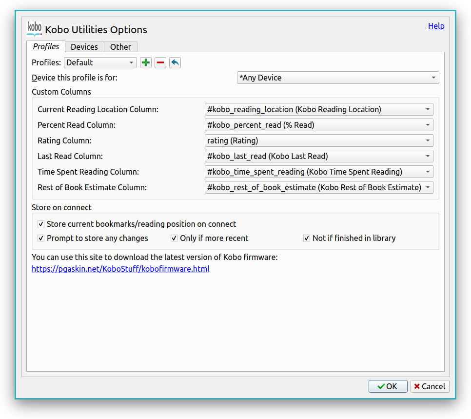 Supported devices All Kobo e-ink ereaders are supported if calibre supports them. Some functions are not supported on the original Kobo eReader or the WiFi. Supported Calibre versions The oldest supported version of Calibre is 5.13.0. There are a few tests that run against both the oldest supported version and the current version, but they can't catch all issues. Installation Open Preferences -> Plugins -> Get new plugins and install the 'Kobo Utilities' plugin. You may also download the attached zip file and install the plugin manually, then restart calibre as described in the Introduction to Plugins thread. Configuration Before use, some configuration of the plugin is needed. Pressing the toolbar button will display the configuration options, or it can be reached from the menu. Several custom columns are needed for the full function of the plugin. Pressing the help link will display the help for the plugin. This includes a full description of the columns needed. Usage