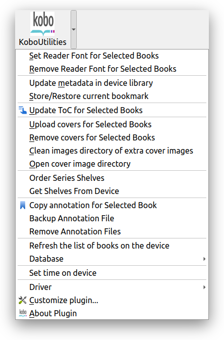 Supported devices All Kobo e-ink ereaders are supported if calibre supports them. Some functions are not supported on the original Kobo eReader or the WiFi. Supported Calibre versions The oldest supported version of Calibre is 5.13.0. There are a few tests that run against both the oldest supported version and the current version, but they can't catch all issues. Installation Open Preferences -> Plugins -> Get new plugins and install the 'Kobo Utilities' plugin. You may also download the attached zip file and install the plugin manually, then restart calibre as described in the Introduction to Plugins thread. Configuration Before use, some configuration of the plugin is needed. Pressing the toolbar button will display the configuration options, or it can be reached from the menu. Several custom columns are needed for the full function of the plugin. Pressing the help link will display the help for the plugin. This includes a full description of the columns needed. Usage