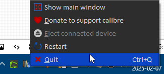 If you had Calibre in system tray you can restart from there. Not much else. Last edited by ownedbycats; 02-07-2025 at 05:19 PM. |
