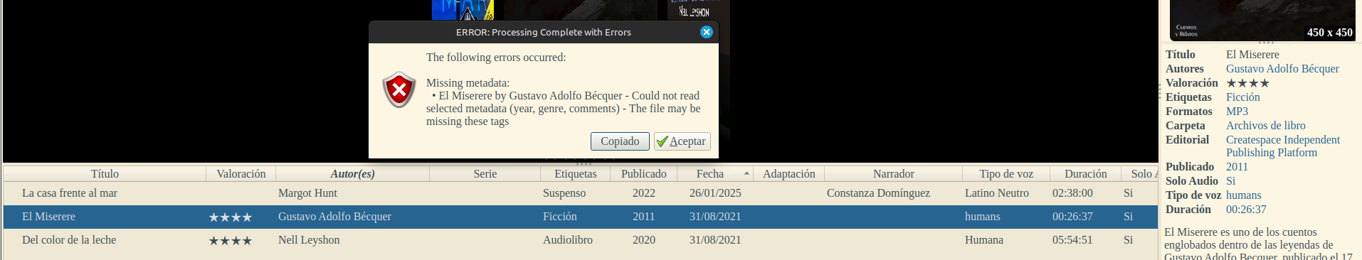 My question is, apart from the duration column, should I create the year and comment columns? Or is it a language issue? calibre, version 7.24.0 ERROR: Processing Complete with Errors: The following errors occurred: Missing metadata: • El Miserere by Gustavo Adolfo Bécquer - Could not read selected metadata (year, genre, comments) - The file may be missing these tags |