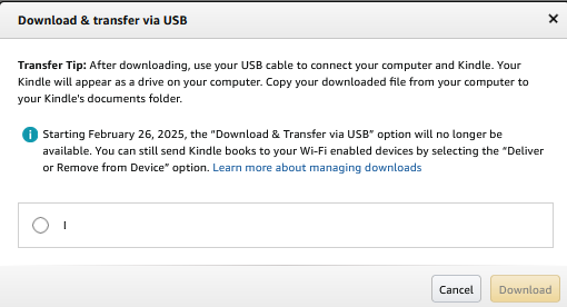 I wonder how slow their rollout of this will be. I just went in and did a download and transfer and had no such message. I'm in the US. I have 2 older devices still registered to my account...a K3 and a K4BNT (K5?)...along with an Oasis 3. Luckily I've been downloading all my Amazon books for years so I don't have to spend the next 2 weeks doing it.