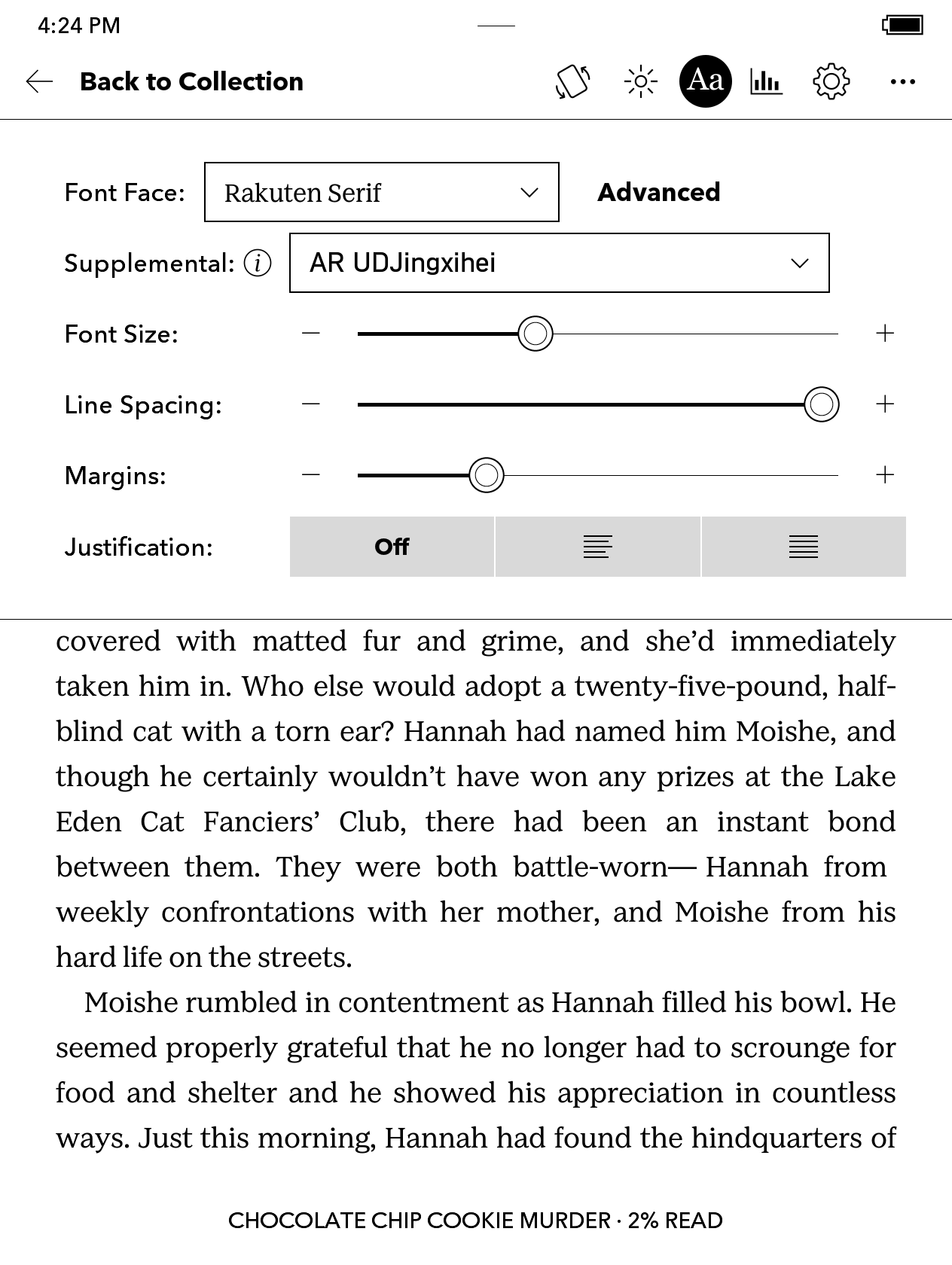 I just tried reading that copy and it does not allow me to change the line spacing in the chapters but I can change the line spacing in the front matter 03 (the one that starts Dear Hannah Fans) for example. The line height also occurs several times in the kobo.css, at the end is: Code: