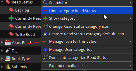 I have been adding custom icons to my custom columns and their children on calibre using Job Spy. While this is working pretty well, I am having an issue where any of the 'children' or sub-category icons for my custom columns are greyed out at the top of the icon. Can someone please tell me how to fix this or give me the correct size/resolutions i should make my custom icons so that they fit properly in the given space without being greyed out? I would rather keep them the maximum size and get rid of the grey area, but if this isnt possible, then so be it. When you expand a standard column, the icons are not greyed out even if you are using custom icons, so i don't know why this only affects custom column icons on calibre. I have attached a couple of images... the first is a standard column expanded, with no greyed out area at the top. The second is the custom column where you can see each icon is greyed out at the top. Thanks for the help. |