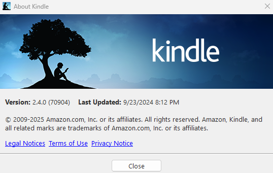 To be pedantic, it is K4PC version 2.4.0 (build 70904). The only place you will see the 2.4.70904 is in the name of the installer file ( KindleForPC-installer-2.4.70904.exe with SHA-256: E2E4E5BB9FD585947244A4A62CE5BACA47818C439D0213CC9A 5A96F9A692119 )