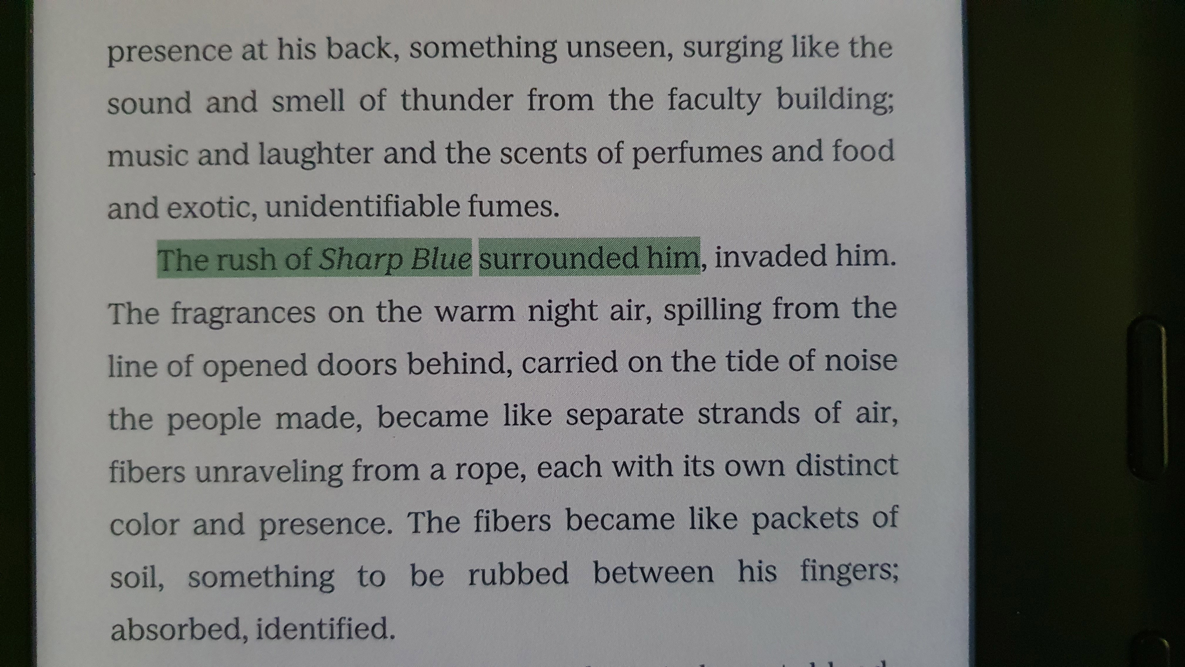 <p class="calibre5"><span class="koboSpan" id="kobo.52.1">The rush of </span><em class="calibre2"><span class="koboSpan" id="kobo.52.2">Sharp Blue</span></em> <span class="koboSpan" id="kobo.52.3">surrounded him, invaded him. </span><span class="koboSpan" id="kobo.52.4">The fragrances on the warm night air, spilling from the line of opened doors behind, carried </span><span class="koboSpan" id="kobo.52.5"> on the tide of noise the people made, became like separate strands of air, fibers unraveling from a rope, each with its own </span><span class="koboSpan" id="kobo.52.6"> distinct color and presence. </span><span class="koboSpan" id="kobo.52.7">The fibers became like packets of soil, something to be rubbed between his fingers; absorbed, </span><span class="koboSpan" id="kobo.52.8"> identified. </span></p> Code: