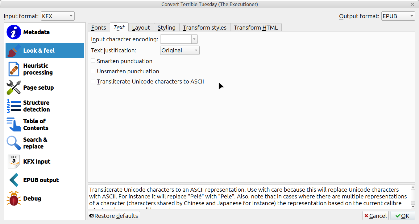 When looking at the stylesheet of an ePub that has been converted from KFX: 1. "Line height" is inconsistently "unitless" in heavily-illustrated books (and this includes, sometimes, tables of data that were embedded as a graphic). In the stylesheet (usually stylesheet.css), some styles will contain each of the following (all of which are/should be valid ePub characteristics): line-height: 1.29017; line-height: 129.017%; line-height: 1.29017em; This bugs me; it's inconsistent with good laboratory practice — and ability to maintain files over time. It has bugged me about the graphic-design community for several decades, so it may have nothing whatsoever to do with Calibre or any plugin or even KFX. The reason that I think this may be Calibre is that the first one (the purely unitless one) only appears in "line-height" and margin/padding, never in font size or text-indent. This is a "I'm trying to understand" thing more than a bug report; but... 2. Conversion to different kinds of margin (and padding) shorthands in the ePub stylesheet seems completely random, even within the same book. One might find all of the following in the same ePub stylesheet (I just did this morning): margin: 0 0 6.24399%; margin-left: 6.24399%; margin-left: 0.5em; margin: 0 0 0 6.24399%; This one is closer to a bug report than item 1, but the code still "works" so maybe it's not a true "bug." It is in all probability related, somehow, to "what font was specified in the KFX file, whether that font was embedded, and whether that embedded font was subsetted (possibly who subset it, too)." But it's puzzling; specifically, what's puzzling is which form for {editorial comment: STOOOPID choices in the CSS specification for "shorthands", so definitely not a Calibre issue} stating the "margin" is chosen. 3. Where, oh where, does the "this book sometimes specifies percentages and sometimes specifies ems" business come from? Is there a way to force conversions to choose one or the other? |