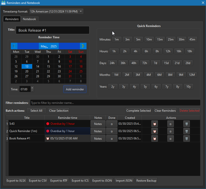 ![]() A comfy Calibre plugin that provides a combined reminders and notebook system with notification alerts, rich export options (XLSX/CSV/RTF/ICS), filtering capabilities, batch actions, and automatic backups. Features Version 1.2 enhances the Comfy Reminders plugin for Calibre by introducing the ability to create reminders based on custom date columns in your library. This means you can now automatically set up reminders using dates from any date-type column in your book database, making it more flexible for tracking book-related dates and deadlines. How to: click Settings to choose a custom date column. Then you can either: - Right click the plugin toolbar button and select "Create reminders from selected books" or - Add the plugin to context menu for books in the library Version 1.3.1: - detects duplicate reminders when adding from custom columns - newly added reminders will show on top of listing - added category selector to notebook entries - reorganised the exporting actions - added support for built-in Published column - now issues a feedback message if user doesn't add a reminder title - basic translation support - added timestamps to filenames on exports - linux support fix Installation [Install from Calibre] 1. Open Calibre Preferences -> Plug-ins -> Get new plugins. 2. Select Comfy Reminders from the plugin list, and click [Install]. 3. Restart Calibre [Load from file] 1. Download the latest release zip file 2. In Calibre, go to Preferences → Plugins → Load Plugin from File 3. Select the downloaded zip file 4. Restart Calibre Basic Operation