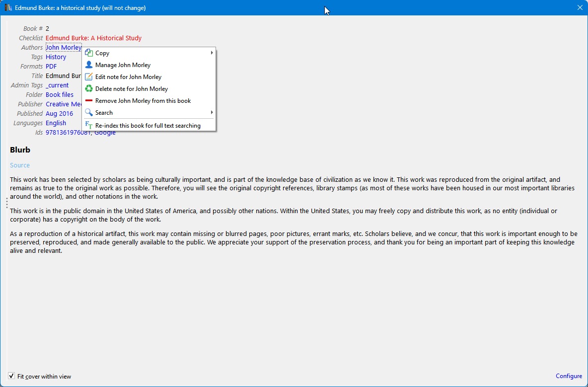 But I think I have a straightforward demonstration - the attached zip contains a 2 book (PD) library and a settings folder from 8.2.1 portable. There are no plugins installed, and minimal customisation. I am assuming you have a keyboard with the menu (≡) key, if not use Shift+F10. With the first book selected press ≡, select Book details->Show book details on a separate locked window Tab to the Author value (John Morley), when you press ≡ and arrow keys you should see this: Now Tab to the Tags value (Historical), when you press ≡ you should see this… which is not what one would expect: Now Tab to the Format (PDF), then Backtab (Shift/Tab) to the Tags value (Historical), when you press ≡ you should see this… which is what one would expect: I coped the two books to the default Calibre Library, without copying the custom columns, and got the same result. Added 1: there's no good reason for having two books. One is enough. Added 2: But three is better. I've add Tolstoy's Anna Karenina to the Demo Library. The ≡ key gives correct response for Author and Tags, but not for Publisher. Whereas on the Morley books the ≡ key gives correct response for Author and Publisher, but not for Tags. Other books in other libraries give incorrect responses for Author and Tags but give the correct response for Publisher. BR Last edited by BetterRed; 04-13-2025 at 07:23 PM. Reason: see added |