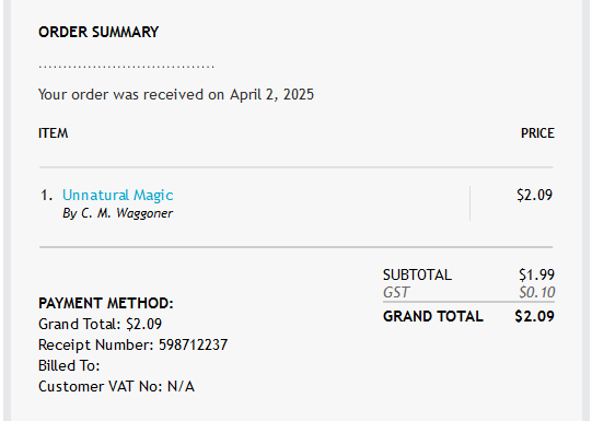 For what it may be worth, I've attached partial images of two receipts that Kobo emailed me. One was a book purchased using the Buy Now and the other was using Add to Cart.
