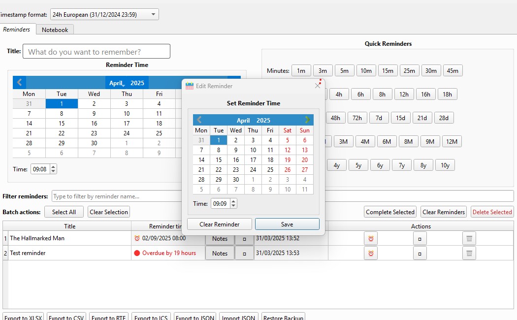 I am liking this addon and thank you for the effort to create it. ![]() Two issues I have noticed 1. The reminder showing "Overdue by 19 hours" in the image I created this yesterday and was set to alert me at 9am today. It is now 9:14am It shows 19 hours overdue and I believe this is calculating the interval off the Created time, not the Alarm time. 2. For some reason, I was having issues with the "Hallmarked Man" reminder which is set for 2 Sep 2025. Whenever I exited Calibre and restarted yesterday, it kept telling me the alert was Overdue, even though there were still 6 months to go. Can't replicate the issue today. Maybe something to do with using the Created time instead? And one feature request... 1. Any chance of a pop-up alert when a reminder has fallen due? Open Calibre and a few seconds later a dialogue appears with the Reminder details?
