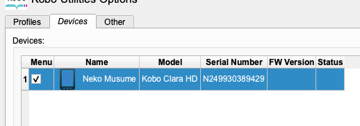 Both devices are Clara HD. The attached screenshot shows the KU Devices tab with neither reader connected. If I plug either of them in, the Status field shows connected, even though they should (logically) have different serial numbers. If I do a database backup, one of the devices' backups gets named with that serial number, but the other uses a different serial number, one ending in 297. So at some level KU can distinguish between them, but not at the top level where it would decide which profile to use. It's the same whether I use my Mac or my Windows machine (I'm trying to set it up so I only use the Mac for both). Freshly updated Calibre on both, so 8.2.1, but I saw the same thing the first time I tried this maneuver, back in the 7.x days. So I don't think the OS or Calibre versions are relevant here. Where does KU get the serial number from when it first sees the device, and where does it get the serial number from when it does a database backup? If those are different, that would be a big clue toward figuring out how I fouled up. |
