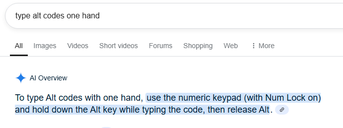 Also because of AltGr and Compose (which is tap, not hold down) I'd not need Alt Codes. Some compose key sequences or AltGr do use Shift: AltGr & Shift ÁΩẂÉ®ŦÝÚÍÓÞ Capital/UC Greek is Compose G <key> Ω vs Compose g <key> ω |