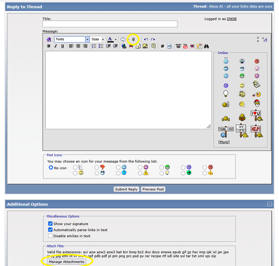 You can post compiled files here. In Advanced mode, you can use either the Paperclip icon or the Manage Attachments button. Add the compiled file(s) to a .zip archive (maximum archive size is 40MB) before attempting to attach them.