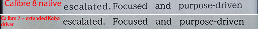 I've noticed that KEPUBs converted by Calibre 8 onwards have badly broken justification (see comparison shot). I raised a Calibre bug here: https://bugs.launchpad.net/calibre/+bug/2107778 It was discovered that the output is different apparently in how the spaces are placed in or around the span tags. This apparently breaks justified text on the Kobo. Was informed by Kovid that this was necessary to fix highlighting without ugly gaps, which was more important, since justified text was not an important part of reading, and that I was the only one complaining. And that his recommended solution would be to simply not use justified text. :shrug Which is fair enough, but I'd love to see if anyone's discovered a workaround for those who use text justification? Is there also some possibility of some config on the device causing this and potentially approaching a fix from that angle? |